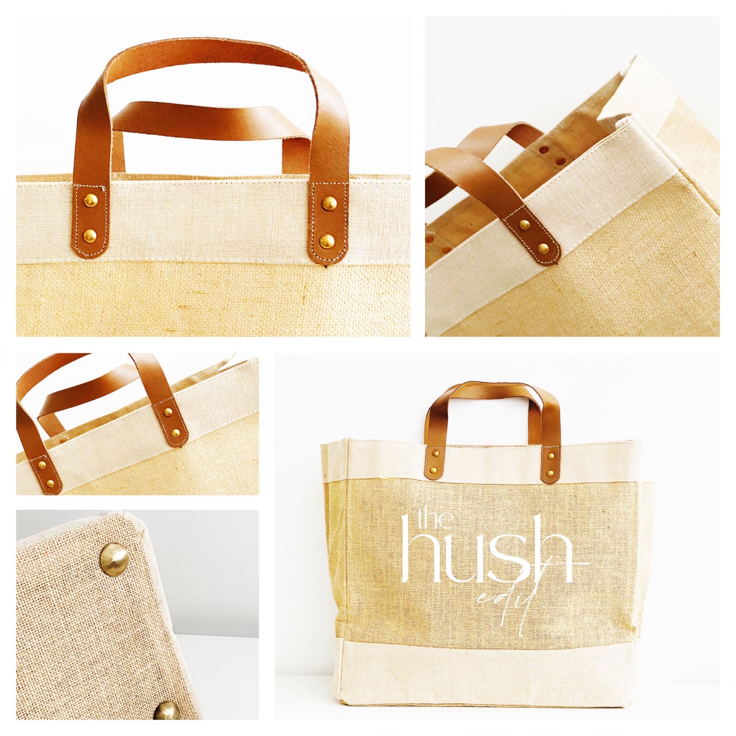 A custom tote shopping bag, beach bag, or gift bag. It is possible to print your logo on this bag, please send logo before ordering. The perfect gift idea for your special clients, customers, and staff. Lots of personalised designs are available for this gorgeous custom bag. Made from environmentally friendly jute material with some juco detail and finished with luxury leather handles and brass feet on the base. With the ability to wipe clean inside and wipe clean the base plate add to the charm of this luxury jute shopper